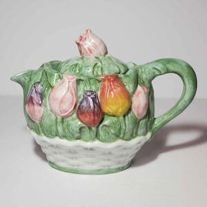 Basket of tulips teapot. Handcrafted in Thailand. Holds 4 cups. Approximately 6.5" and 8.75" across from spout to handle.