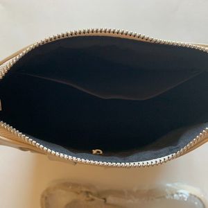 Basket Weave Bucket Bag / Purse in Tan. Faux leather with a detachable crossbody strap. Inside find a black linen lining with one zip pocket and one slip pocket. Bag has a zipper close with silver accents. New in manufacturers packaging. 7" H x 9" L x 4" W makes it the perfect lightweight medium size to carry all essentials.
