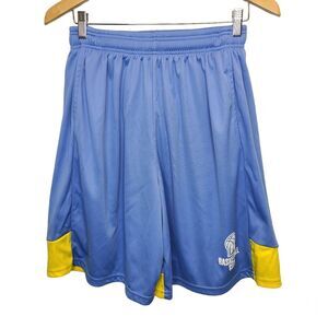 Basketball City Mens Blue Yellow Basketball Shorts Large. Soft & comfortable athletic shorts. Colors are baby blue & yellow. Drawstring on inside waistband. Logo hit on bottom left leg.