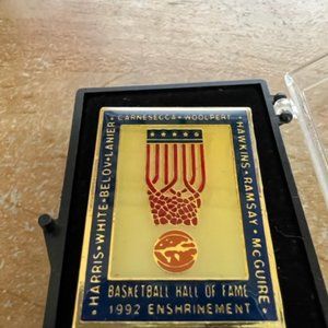 Basketball Hall of Fame 1992 Enshrinement Pin. The following names are listed around the edges of the pin: Harris, White, Belov, Lanier, Carnesecca, Woolpert, Hawkins, Ramsay, McGuire