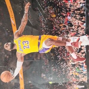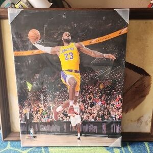 Dynamic Lebron James basketball poster featuring a player in a yellow jersey. Perfect for sports enthusiasts. Canvas Picture measurement 16 inches by 20