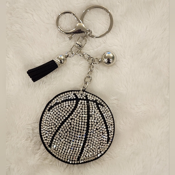 Sparkling rhinestone basketball soft keychain with silver accents. Perfect for sports fans.