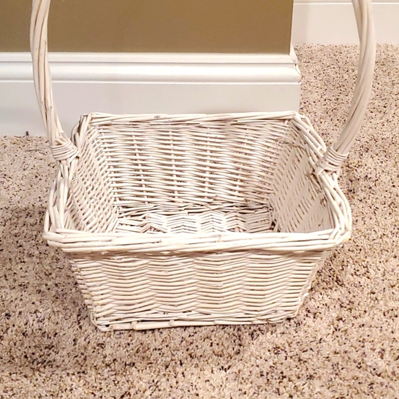 One white wicker square basket. The handle seems a little crooked, but it was purchased that way.