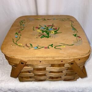 This is a rare, vintage Basketville picnic basket from Putney, Vermont. It is a large, square basket with swing handles and a painted floral top. The basket measures 8 inches in height, 13 inches in length, and 13 inches in width. It is perfect for collectors of decorative baskets or for those who enjoy outdoor picnics.