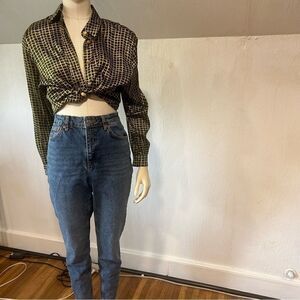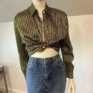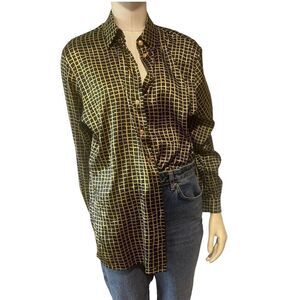 Basler Vintage Navy Blue/ Yellow Gold Plaid Pattern Button Down Satin Blouse