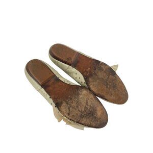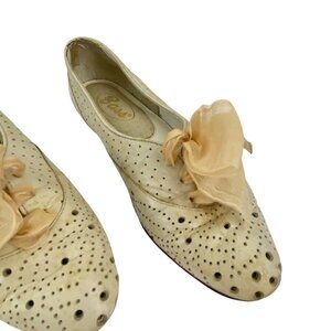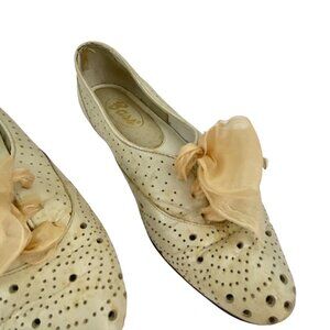 These vintage Bass flats are an exquisite representation of timeless elegance. Crafted from finely perforated cream leather, they exude sophistication. The delicate bow embellishment adds a whimsical touch, while the soft hues provide versatility to complement various outfits. Ideal for those who appreciate classic style, these flats offer both comfort and charm in equal measure.