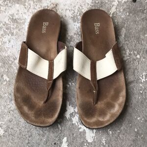 These flip flops have suede with elastic stretch that looks like canvas . Have the foot in print but the soles are brand new