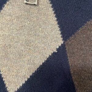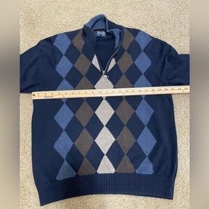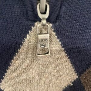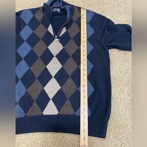 Keywords: Bass, argyle sweater, quarter zip, pullover sweater, mens sweater, knit sweater, blue sweater, brown sweater, casual sweater, medium sweater, menswear, fall fashion, winter fashion