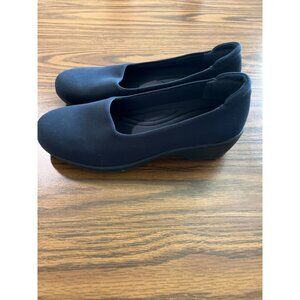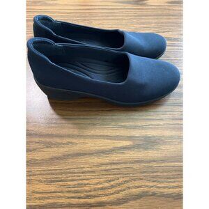 Bass Go-To-Comfort Donna navy blue slip on shoe size 9M. Heel measures approximately 2”. Good pre-owned condition.