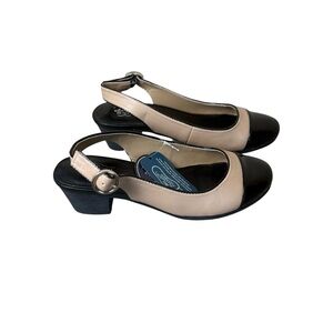 •Style Profile: Bass Go-To-Comfort Womens Black & Tan Patent Leather Toe Sling Back Dress Shoes