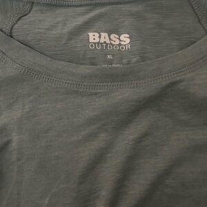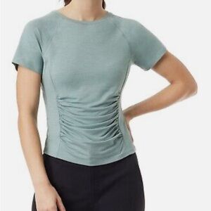 This fitted green tee from Bass features a stylish raglan neckline and sleeves, complemented by elegant ruched detailing along the sides. The stretchy fabric ensures a comfortable fit, making it a versatile addition to any wardrobe.