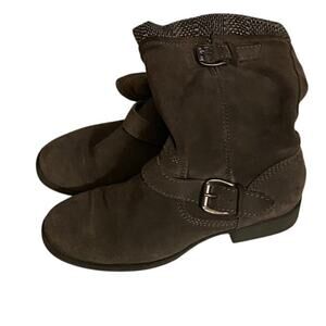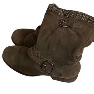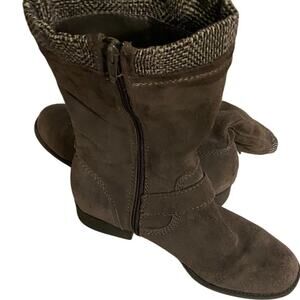 Bass Petro women’s mid-calf boots in size 9, crafted with a genuine leather suede upper in a versatile gray tone. These stylish boots feature a ribbed knit cuff at the top, decorative straps with metal buckle accents, and a side zipper for easy wear. Heel measures approx. 1" and shaft height is approx. 9". Designed for comfort and durability with a flat rubber outsole, these boots are perfect for everyday wear during fall and winter. Pre-owned and in very good condition with only light signs of use. A classic pair that combines casual style with reliable quality.