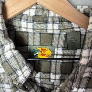 Bass Pro Shops, flannel shirt, men’s 2XL, green plaid, 100% cotton, button down, long sleeve, rugged outdoorswear, soft flannel, cabin core, utility style, vintage workwear, naturecore, streetwear layering, fall essential, grunge aesthetic, dadcore, heritage style, oversized fit