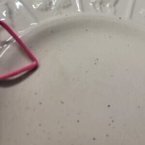 Cream/tan ceramic plate with brown rim and rustic speckled finish.