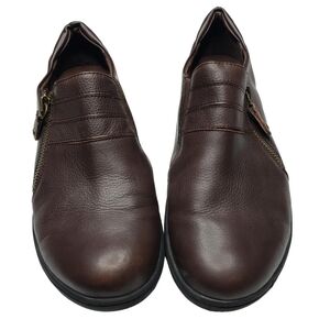 Excellent used condition! Chocolate brown, genuine leather upper. Round toe. Comfort, cushioned foot bed. Outer zip closure.