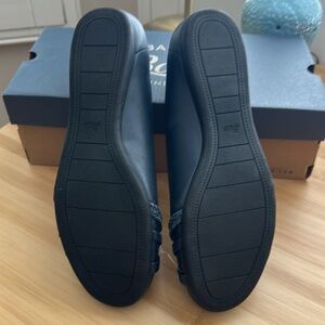 Chic black loafers by Bass. Features braided accents and buckle detail. Ideal for versatile wear.