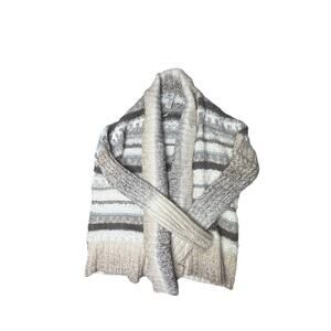Stay cozy and stylish with this beautiful Bass cardigan, size medium. Crafted from a luxurious wool and alpaca blend, this soft and warm knit features a mix of neutral earth tones—beige, taupe, grey, brown, and creamy white—in a subtle horizontal stripe pattern. The thick ribbed shawl collar and cuffs add extra warmth and a rustic-chic vibe.