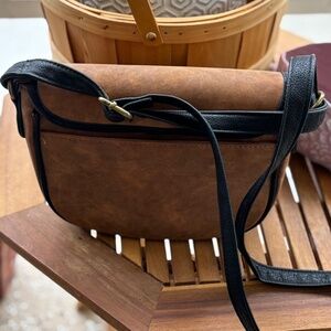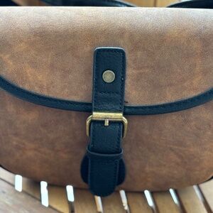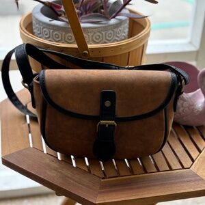 Perfect preowned condition. Beautiful Bass leather crossbody. Brown leather with black leather trim. Brass hardware with a magnetic front clasp. The two toned leather makes it easy to match to any outfit. I will be happy to answer any questions or provide more photos.