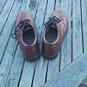 1. Presenting a pair of Bass derby oxford shoes in a rich brown hue, elegantly displayed on a rustic wooden table. Designed for both comfort and style, these size ten shoes feature a classic silhouette that complements various outfits, making them a versatile addition to any wardrobe. The quality craftsmanship ensures durability, while the timeless design offers a sophisticated touch for both casual and formal occasions.