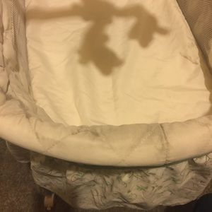 Green and white , vine/leaf pattern with head visor attached and Sheep Mobile (Plays music, Lights up and spins) minimal staining on outside not inside (not that noticeable) . Comes with mattress