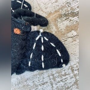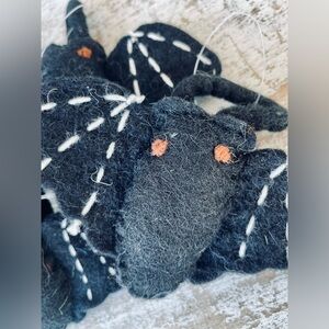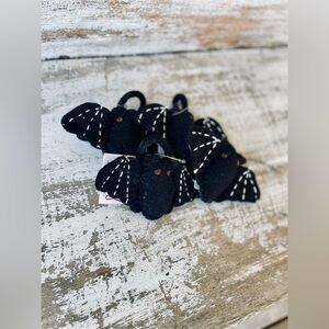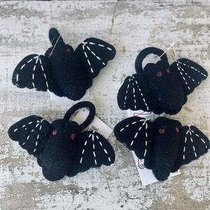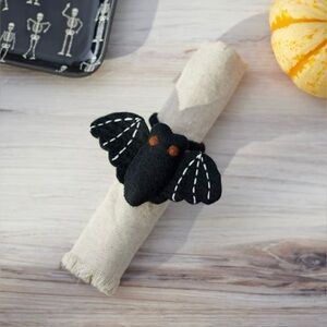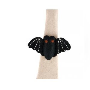 A felt napkin ring displaying a stuffed bat design. Bat features colored felt pieces stitched together with additional stitched details. Our Bat napkin ring includes attached felt ring to easily slip over rolled napkin and can be added to table setting as a fun accent. Napkin pictured not included. A fun tabletop accessory perfect for seasonal gatherings. Measures approximately 5.25”x3.25”x1”. Comes as a set of 4.