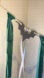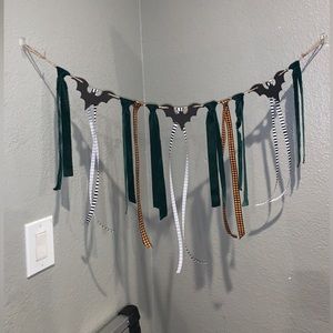 Cute Bat Banner, handmade. With black wooden bats, on twine; with green velvet ribbons, orange and black checkered ribbon and white and black glitter ribbon.