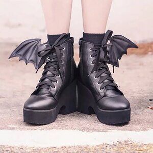 In a word, Awesome! Here’s what I love about these shoes, the bat wing is laced onto the shoe so it’s easily removed providing versatility. Needless to say these are great for Halloween and any other vamp inspired occasions, but they are a statement piece on their own. Super lightweight. Lace up or easily zip on/off.
