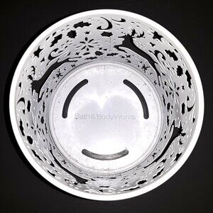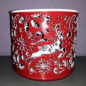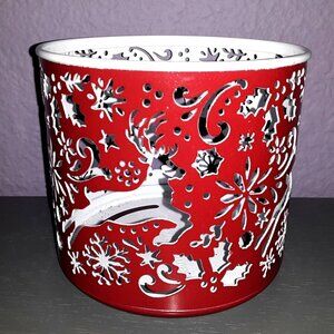 Bath & Body Works large 3 wick metal candle holder. Red and white Christmas cut-out design featuring deer, snowflakes, stars, and holly leaves. Very good condition.