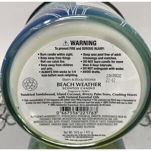 Light up your senses with this gorgeous jar candle from Bath & Body Works. With a pleasing BEACH WEATHER scent and multiple wicks, this candle will fill your room with a charming fragrance. The jar design is perfect for adding a touch of elegance to your space, with a large size that ensures a long burning time of 25-45 hours. Made of soy blend wax, this candle is perfect for anyone who loves the subtle glow of a candle. Whether you're looking to create a cozy atmosphere or simply want to indulge in luxurious scents, this candle is the perfect pick.
