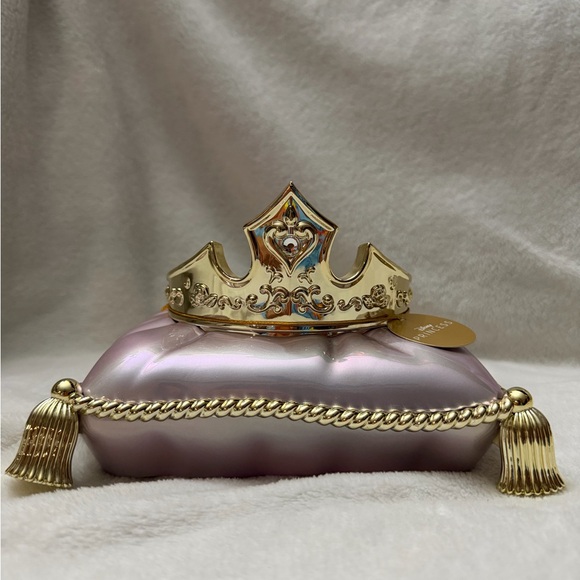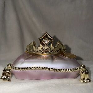 Celebrate the gentle grace and beauty of Princess Aurora. An exquisite crown resting softly on a cushion, this candle holder embodies the elegance of this timeless princess. Tassel designs on the satin-looking cushion and embossed embellishments on the gold-tone crown make this the must-have accessory for a princess.