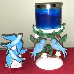 Bath & Body Works BLUEBIRDS THREE WICH PEDESTAL CANDLE HOLDER + WALLFLOWER PLUG
