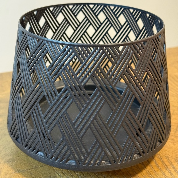 Sleek matte black metal candle holder sleeve from Bath & Body Works featuring a modern geometric lattice design. Clean lines and a neutral finish make this a perfect fit for contemporary, minimalist, or masculine home décor.