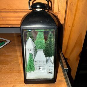 This elegant lantern from Bath & Body Works features striking black and green accents, perfect for adding a touch of sophistication to any space. The minimalist design highlights a charming winter village scene, with green trees providing a vibrant contrast to the white architectural silhouettes. Ideal for creating a festive atmosphere, this lantern is a stylish addition to your holiday decor.