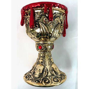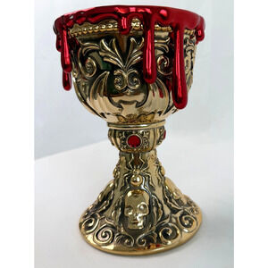 The Bath & Body Works Blood Drip Skull Chalice 3 Wick Halloween Candle Holder is a medium-sized, round metal candle holder with a striking skull pattern and gothic style. This limited edition piece is suitable for 3-wick candles and features a gold finish, making it a perfect addition to a Halloween decor collection. With its horror theme and mystical fantasy design, this candle holder adds a touch of whimsy and intrigue to any space, making it a unique and eye-catching collectible for the 21st century.
