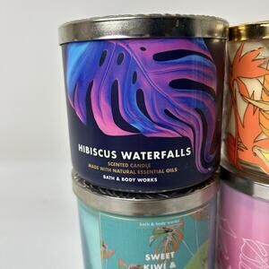 The product is a lot of 4 large scented candles by Bath & Body Works in a tropical scent. Each candle has 3 wicks, providing a longer and more intense burn time. Perfect for creating a relaxing atmosphere in any room, these candles are sure to add a touch of tropical paradise to your home.