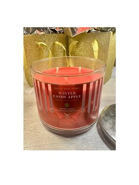 Bath & Body Works three-wick scented candle. Gold metallic label with iridescent accents. Soy wax blend for a clean burn. Elegant, celebratory presentation.