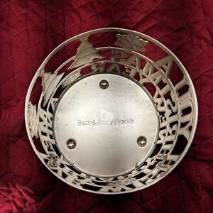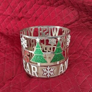 Add a festive touch to your home with this Bath Body Works Christmas 3 wick candle sleeve. The round candle holder features a colorful design of merry Christmas in red, green, and silver. It is suitable for 3-wick candles and made of metal, making it a durable and decorative addition to your home.