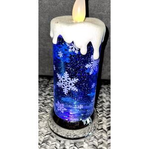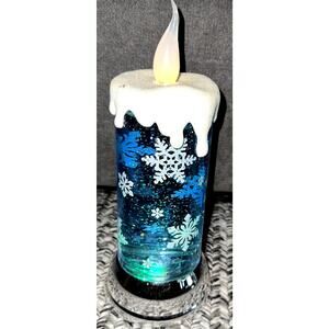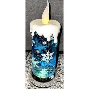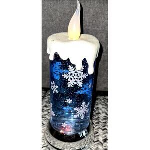 Add a magical touch to your holiday display with this Bath & Body Works candle-shaped snowglobe! Featuring a festive snowflake design and a swirling internal glitter rotation, this piece mimics a flickering candle while bringing movement and sparkle to your seasonal decor. This is color changing, but hard to get the pictures to reflect the different colors. 10" tall.