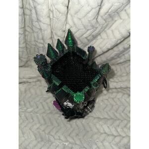 Decorative candle holder from Bath & Body Works featuring a dark castle design inspired by Maleficent. Detailed gothic castle with green metallic accents and sculpted dragon wrapping the base. Designed to hold a standard Bath & Body Works 3-wick candle.