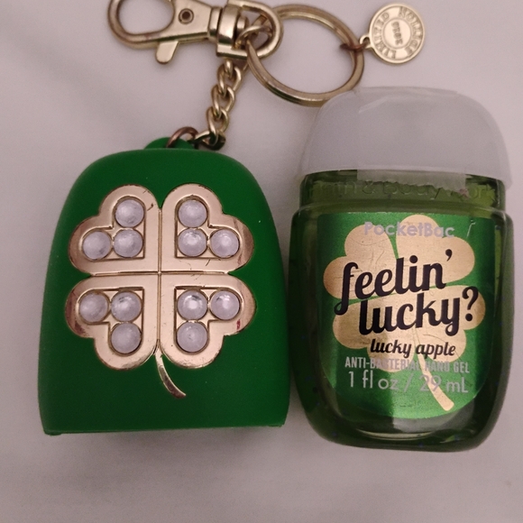 retired shamrock design sanitizer holder original BBW in Boston accent gold coloring does have slight mark on upper left cpic with sanitizer feeling lucky label great not responsible for any dissipation during mailing will pack with care