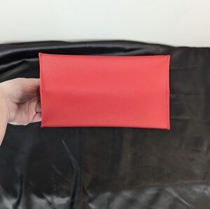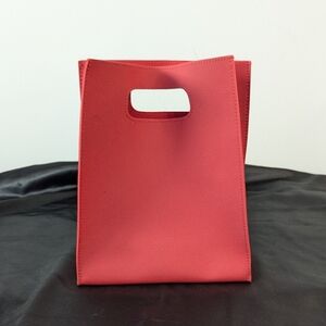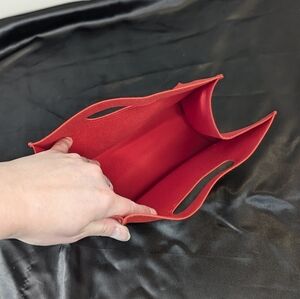 The thick material feels like imitation saffiano leather. The interior is fully lined with a soft red felt. This will make a great gift bag for whatever goodies you're gifting, and your loved one can reuse it throughout the year!