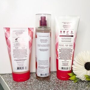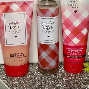 Bath and Body Works Gingham Love Gift Set. Foaming Sugar Body Scrub, Spray, and Body Lotion Cream. Full size. New. Sold as set only. Includes gift bag and bow for easy gift giving.