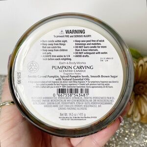 Bath and Body Works Halloween Fall Candle Pumpkin Carving. Scents of Freshly Carved Pumpkin, Spiced Pumpkin Seeds, and Smooth Brown Sugar. 14.5oz, full size. Bundle to save.