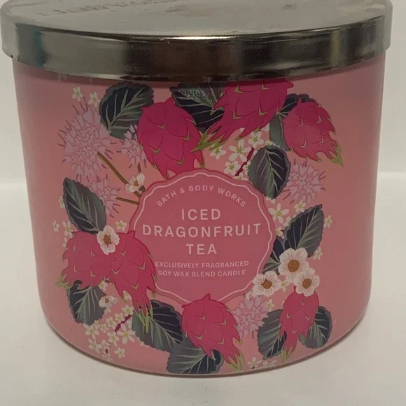 Enjoy the vibrant scent of iced dragonfruit tea. Pink candle with silver lid.