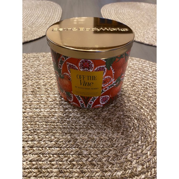 Keywords: Bath Body Works, 3 wick candle, Off The Vine, Heirloom Tomato, Garden Geranium, Mediterranean Moss, scented candle, soy wax blend, home fragrance, decorative, gift, relaxation, ambiance
