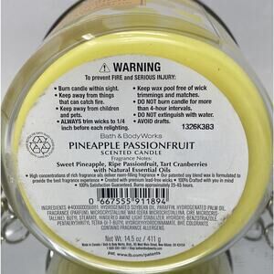 Light up your living space with this gorgeous candle from Bath & Body Works. The pineapple passionfruit scent will take you on a tropical journey, while the multiple wicks ensure an even burn and longer burning time. This round jar/container candle is made of soy wax blend and comes in a large size, perfect for any room in your home. The vibrant yellow color adds a pop of brightness to your décor. Made in the United States, this scented candle is perfect for those who love a touch of luxury in their everyday life.