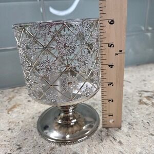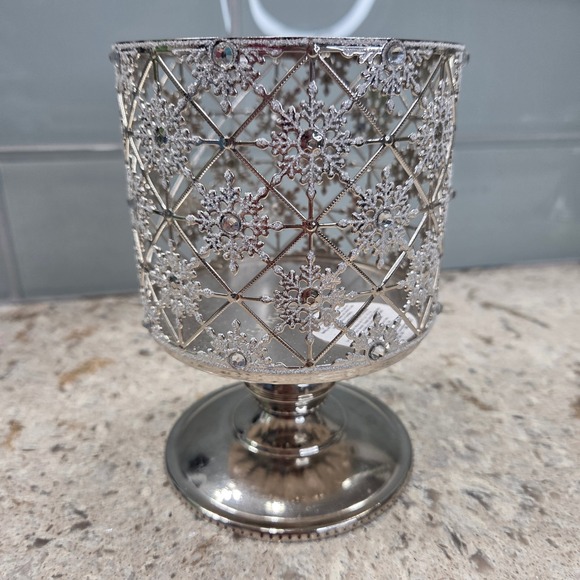 Keywords: Bath Body Works, candle holder, snowflake, pedestal, silver, Christmas, holiday, winter, decor, filigree, embellished, elegant, centerpiece