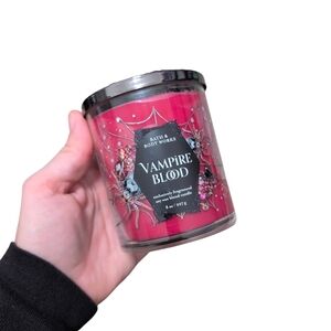 Experience the enchanting aroma of the Bath & Body Works Vampire Blood Candle. This red candle adds a touch of mystery to your space. Red berries, night-blooming jasmine, and petrifying plum. Smells so good!