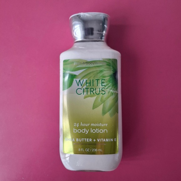 Bath Body Works White Citrus 24 hour moisture body lotion. This super smooth body lotion offers nourishing moisture and melts into skin with an amazing feel and fragrance. Infused with Shea Butter and Vitamin E, it provides lightweight yet powerful hydration. Perfect for daily use or as a refreshing scent for a spa day at home.