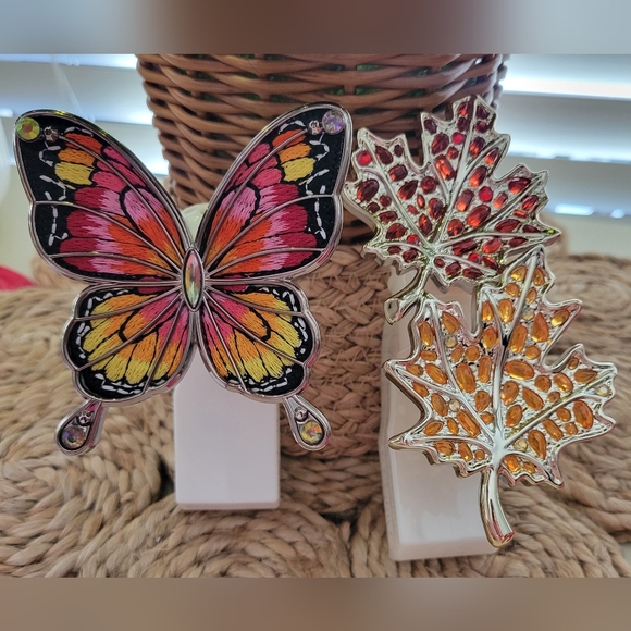 Bath & Body Works vibrant butterfly and leaf wallflower set. Features pink, orange, and yellow hues. Perfect for adding a pop of color. Gently used.
